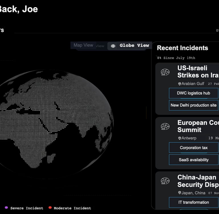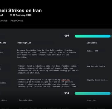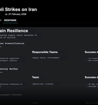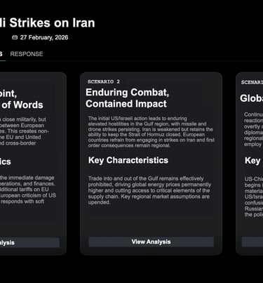 To support executive decision-making under uncertainty, the platform develops three plausible scenarios that frame how an event may evolve and what each pathway could mean for the business. This scenario-led approach helps you and your leadership teams assess risk more rigorously, test resilience more effectively, and act with greater confidence.